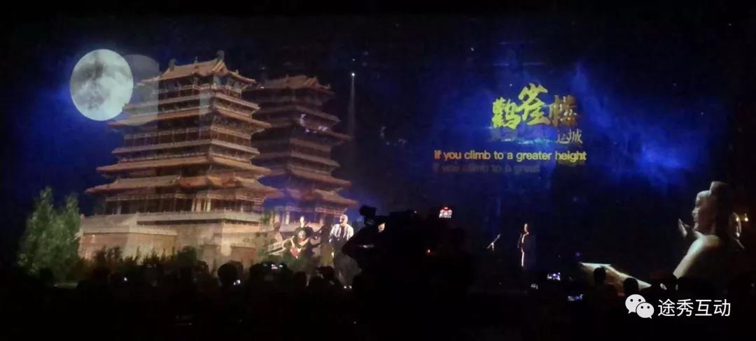 由途秀互动全程创作的《登鹳雀楼》作为此次2018港澳青少年山西长城游学推广活动暨内地游学联盟大会表演的压轴节目,把3D全息投影技术与现场乐队表演相结合,画面一开始就赢得现场呼声,3D全息技术声色兼具的展示了山西的壮阔自然美景和颇具人文气息的历史古建,全景、立体、身临其境地让现场嘉宾感受到“华夏古文明,山西好风光”之魅力,也是对《登鹳雀楼》这首诗的全新演绎。